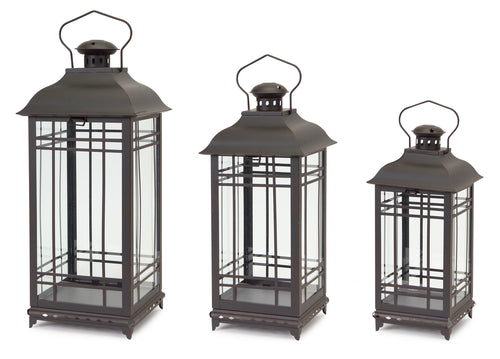 Black iron, footed base, two heights. The kind of lanterns that look like they've been on that table for years. Set one on each side of a mantle or group them on a hearth — they hold a taper or a pillar, whatever you reach for first.
